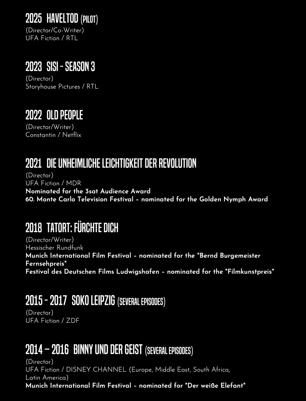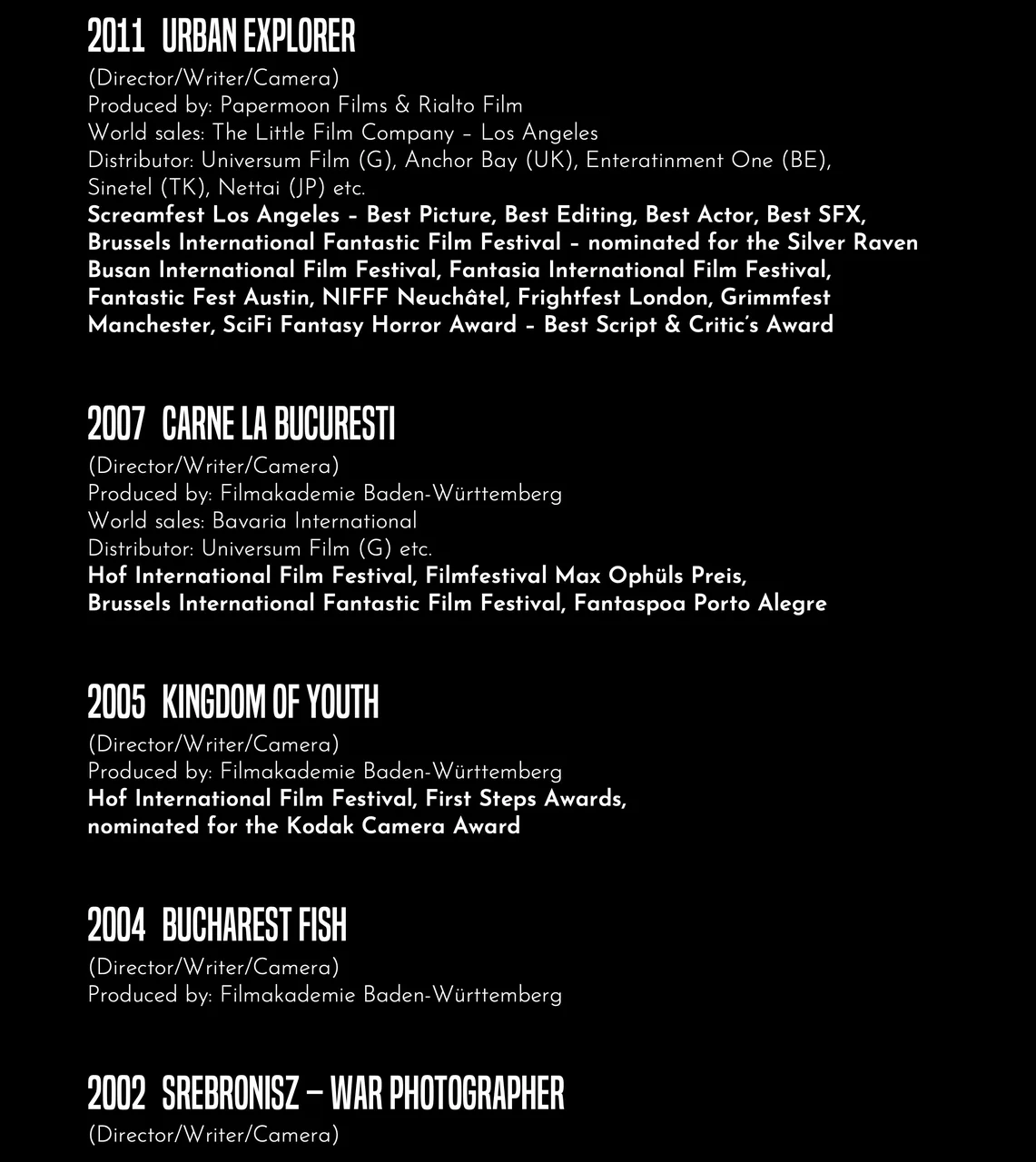 ... is a German-Romanian director, writer and cinematographer. He directed children’s serial programs for Disney Channel, as well as thrillers or crime shows for TV and historical dramas, such as SISI – one of Germany’s biggest TV shows. In his teenage years he worked as a freelance photographer and journalist for picture agencies in Germany. From 2001 to 2007 he studied cinematography and directing at the Ludwigsburg Film Academy, where he began to make a name for himself with a number of short movies as SREBRONISZ – WAR PHOTOGRAPHER and KINGDOM OF YOUTH. He graduated film school with his first full length feature film CARNE LA BUCURESTI, a horror-thriller, which has been invited to numerous international festivals, including Brussels International Fantastic Film Festival and Germany’s highly acclaimed Hof International Film Festival. The horror thriller URBAN EXPLORER was his first co-production with America and has been praised by Variety as „Maximum impact and a balance of craft and patience“. Due to his experience in both directing and cinematography Andy Fetscher's movies fuse fierce storytelling with a strong visual language.